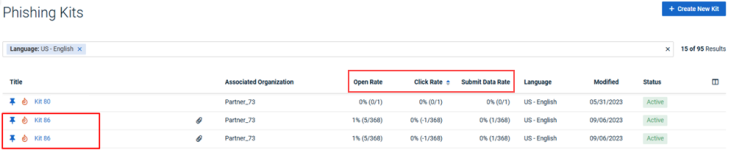 When sorting kits by the Open Rate, Click Rate, or Submit Data Rate columns on the Phishing Kits page, a duplicate kit entry was created in the table for any kit that was used in a campaign.