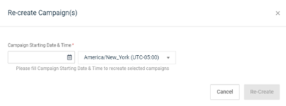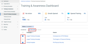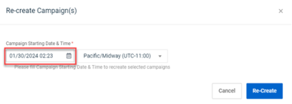 Enhancements have been made to the Campaign Starting Date & Time field when recreating campaigns. The enhancements apply when using the Recreate button on the phishing View All Campaigns page or the training View All Training Campaigns page.
