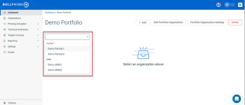 When navigating to the portfolio Dashboard, it now displays without any data. When an organization is selected in the drop-down list, dashboard data is displayed for the selected organization.