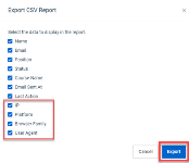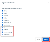 After selecting Actions > Generate CSV Report, the Export CSV Report modal is displayed. The check boxes for all data are pre-selected. You can clear the check boxes for any data you don’t want included in the CSV report.
