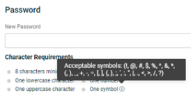 When creating or resetting a BullPhish ID password, the following acceptable symbols displayed in the One symboltooltip were not actually supported by the system: