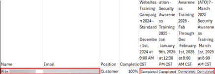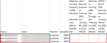 If a target performed multiple actions (including Sent status) for the same campaign within the selected date range in a phishing or training user report, the generated report contained duplicate entries and missing information.