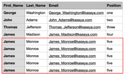When creating a group by importing a CSV file that included duplicate targets, those targets were connected to the group multiple times. In the example CSV file, the target James Monroe with the same email address is listed five times.