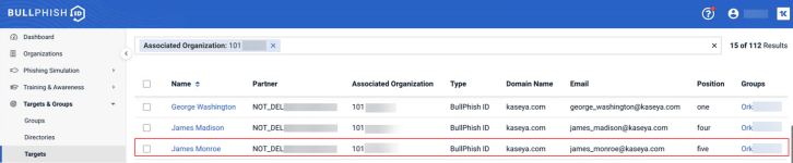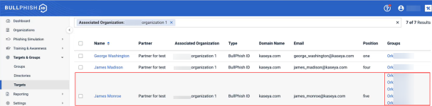 When the Ork group was created using this file, the Targets page showed that James Monroe was connected to the group five times. It's important to note, however, that the target remained a unique user and consumed only one license.