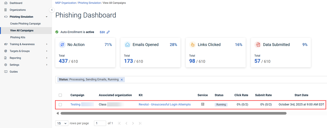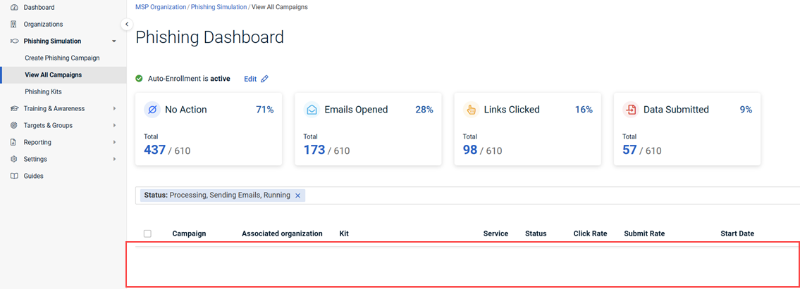 Previously, when the phishing or training In Progress bar on the partner Dashboard indicated there were campaigns in-progress (processing, sending emails, or active), those campaigns were not listed on the Phishing Dashboard or Training & Awareness Dashboard.