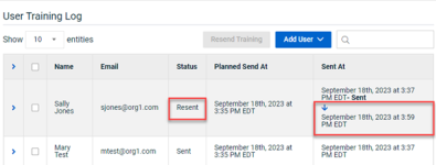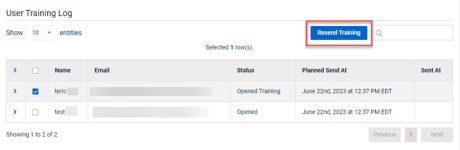 The Resend Training button is available when a target is selected in the User Training Log table on the selected campaign's Details page. Multiple targets can be selected and an email invite would be sent to each target.