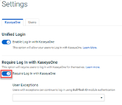 The Require Log In with KaseyaOne feature forces users to login with their KaseyaOne credentials to access BullPhish ID. When the feature is enabled by an organization, users can no longer log into BullPhish ID locally with their BullPhish ID credentials.