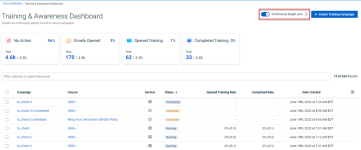 The Continuous Target Sync toggle is available on the Training & Awareness Dashboard (select Training & Awareness > View All Training Campaigns) and applies only to training campaigns.