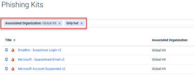 To quickly find these new kits on the Phishing Kits page, select Global Kit for the Associated Organization filter and select the Only hot filter.