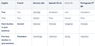The True, False options and the Previous, Next buttons in the training portal quizzes now translate to the languages in which the courses were created. The table provides the language translation for each item.
