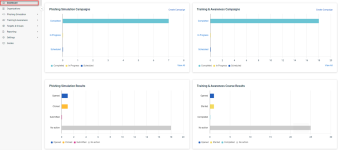 - Partner Dashboard: The Phishing Simulation Campaigns card and Training & Awareness Campaigns card show the campaign status (Completed, In Progress, Scheduled) of all the campaigns for the MSP's direct SMB organizations. The statistics don't include the SMBs associated with the partner's MMEs.