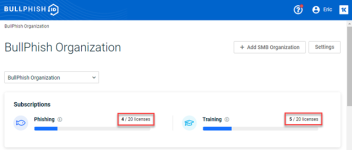 In this example, 4 phishing licenses are in use out of the 20 phishing licenses permitted by the MSP's subscription. 5 out of 20 training licenses are in use.