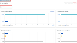 In this example, BullPhish Organization is the MSP. Campaign statistics are displayed for Organization 1, the SMB selected in Organization drop-down list.