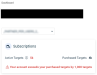 If the number of Active Targets is greater than number of Purchased Targets, the number of Active Targets is highlighted in red text on the Subscriptions card. The number by which the limit is exceeded is indicated as well.