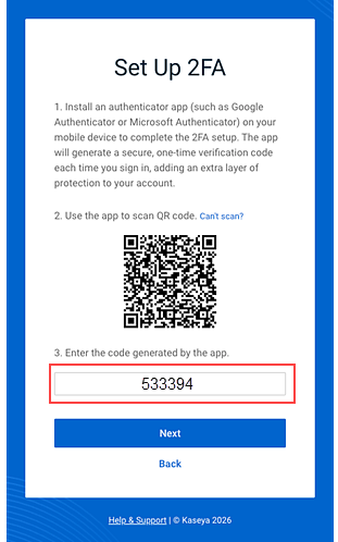 - Your 2FA app will generate an authentication code. In the Set Up 2FA modal - step 3, enter the code.