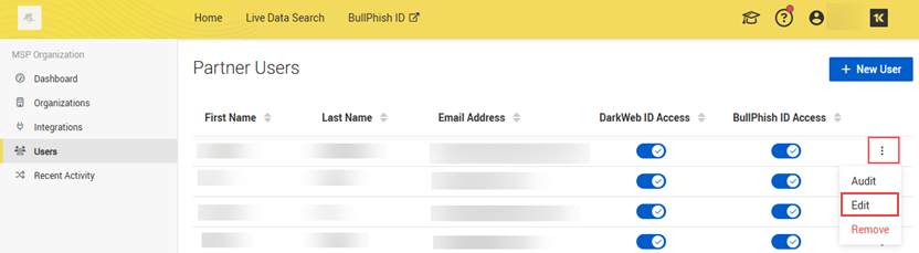 3. For the applicable user, click the More menu (three dots) at the end of the user’s row and select Edit.