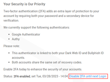 4. In the Your Security is Our Priority section, click Disable 2FA until the next Login.
