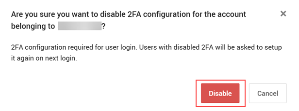5. Click Disable to confirm the deactivation of 2FA for the specified user.