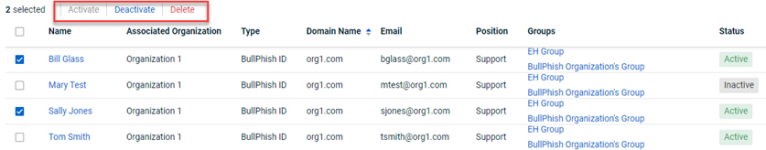 IMPORTANT A target that is synced through a directory sync cannot be deleted in BullPhish ID but you can deactivate the target manually or through directory settings. If a target is deleted from an organization's directory resource, the Directory Sync Preference configuration determines how synced targets are handled in BullPhish ID. Refer to the article, Adding a directory sync.