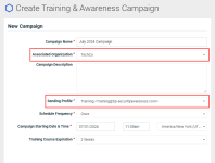 - Sending Profile: A sending profile specifies the email address that will appear as the sender of the email. The Sending Profile field is automatically populated after selecting an organization from the Associated Organization drop-down list. The populated value will be the sending profile used in the last-created campaign for the selected organization.