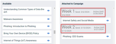 In this example, the Attached to Campaign course information was calculated based on a Campaign Starting Date of 03/06/24, a Scheduled Frequency of Weekly, and a Training Course Expiration of 2 Weeks.