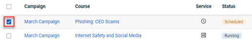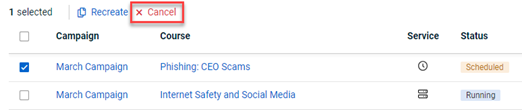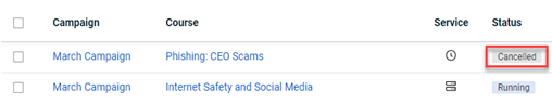 IMPORTANT When canceling a remedial and/or standard training campaign, the confirmation message specifies the campaign type being canceled. It also states that course statistics will be recalculated and that all reports generated after the campaign is canceled will be updated. For remedial training campaigns, the message includes a link to the phishing campaign that triggered the training. To proceed, click the Cancel Campaigns button. To keep the campaign active, click the Keep Campaigns Running button.