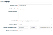 - New Campaign: The information you provide in this section includes the name of the campaign, the organization for which the campaign is being created, the rate at which the training emails will be sent, and the date and time the campaign will start.