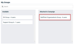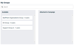 - In the My Groups section, the Available column lists the groups with active targets for the selected Associated Organization. For each you group you want to include in the campaign, click and drag the group from the Available column to the Attached to Campaign column.
