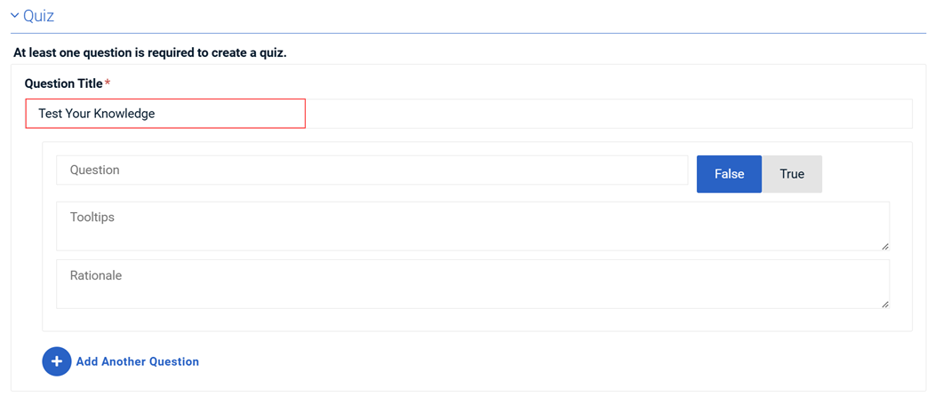 - In the Quiz section, in the Question Title field, enter a title for your quiz, for example, Test Your Knowledge.