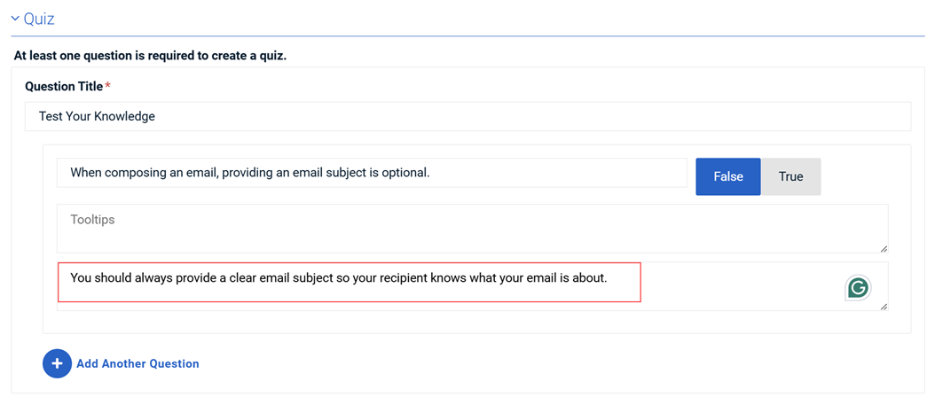 A custom training course requires a quiz with a minimum of one question. Each question must be written as a true or false statement. For example, "BullPhish ID allows me to create custom training courses."