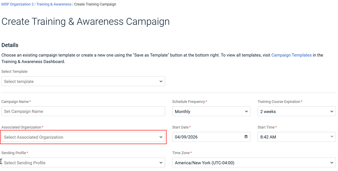 The Create Training & Awareness Campaign page is displayed. In the Associated Organization list, do one of the following: