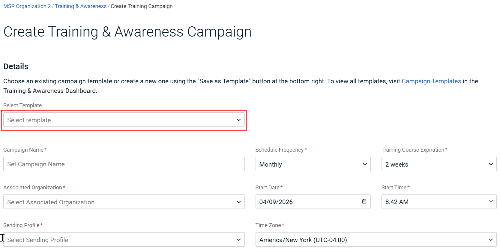 - The Create Training & Awareness Campaign page is displayed. In the Select Template drop-down list, select the desired template. Templates are sorted by modified date with the most recently updated templates listed first.
