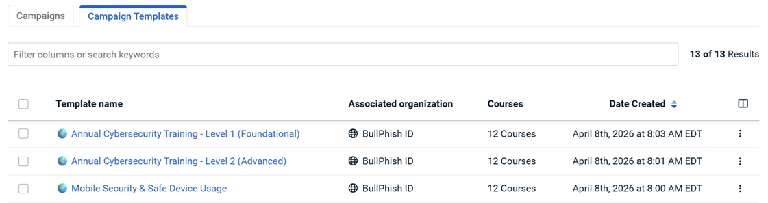 Use the Campaign Templates tab to view and manage training campaign templates. Navigate to Training & Awareness > View All Training Campaigns and click the Campaign Templates tab.