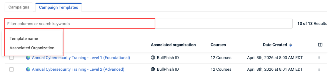 - To list only Global Campaign Templates (BullPhish ID templates), turn on the toggle. Click Apply