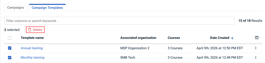 Reusable campaign templates let you create a security awareness training campaign once and reuse it across multiple SMB organizations. This approach reduces setup time and ensures consistent training and messaging.