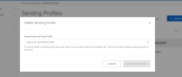 To delete a sending profile, you must select a new sending profile to replace the deleted ones. It will allow the application to replace sending profiles in all places.