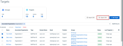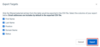 - In the Export Targets modal, you can select the column data you would like included in the CSV file. All of the columns are selected by default. Email addresses are included in the file by default. If you clear a column’s check box, its data won’t be included in the CSV file. Click Export.