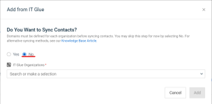 NOTE When you request a new import selection, you cannot see the previously selected and imported list of organizations from Add from IT Glue.