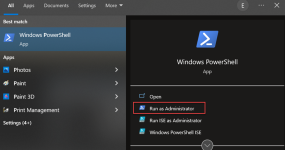 - Start typing Powershell. In the Windows Powershell pane, click Run as Administrator.