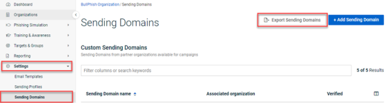 - Download the list of sending domains. To do so, in BullPhish ID, select Settings > Sending Domains. Then click Export Sending Domains.