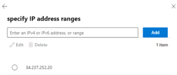 - Copy the first IP address listed below and paste it into the specify IP address ranges field. Click Add. Repeat for the second IP address (if applicable).