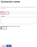 - In the Name field, enter a name for the connector. Description is optional. Leave Turn it on selected. Click Next.