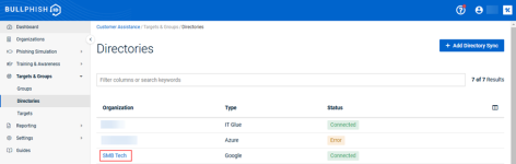 Directory sync allows you to integrate a BullPhish ID client organization with a directory resource, such as Google Workspace or Microsoft Entra ID. The integration enables you to import groups and targets that are automatically synchronized with the directory resource.