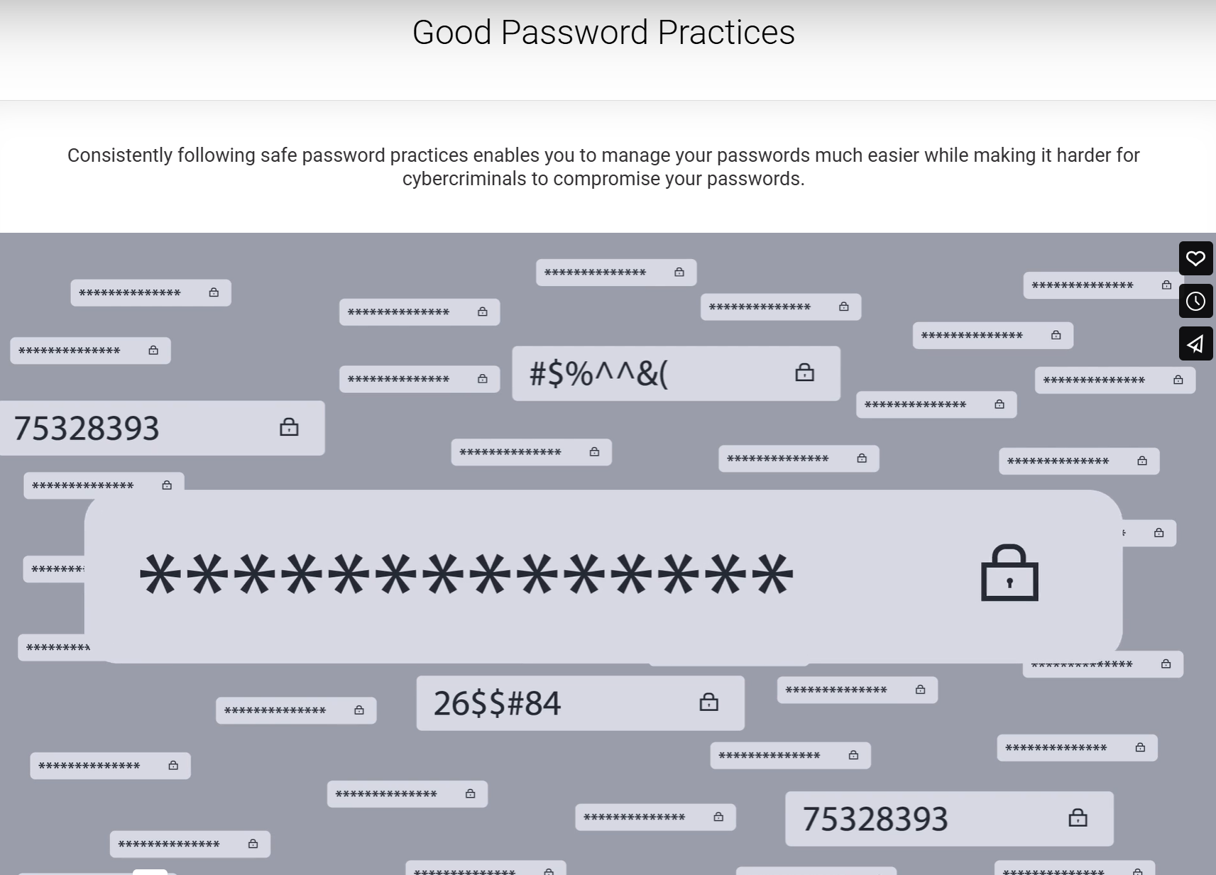 Good Password Practices: Consistently following safe password practices enables you to manage your passwords much easier, while making it harder for cybercriminals to compromise your passwords.